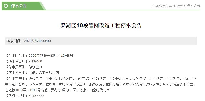 2020年7月9日23時至10日8時,羅湖區(qū)邊檢二院、羅湖金岸小區(qū)、邊檢大院一期二期、羅湖村9號樓、鉑金時代公寓等小區(qū)將停水9小時。
