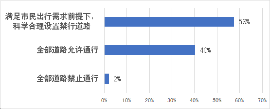 據(jù)調(diào)查,約58%的市民支持在滿足市民出行需求前提下,科學(xué)合理設(shè)置禁行道路;40%的市民認為應(yīng)該全部道路允許電動二輪車通行;僅2%的市民認為電動二輪車應(yīng)當(dāng)在全部道路禁止通行。