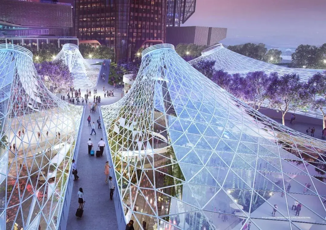 為車(chē)站廣場(chǎng),“水晶山丘”屋面覆蓋著地下車(chē)站樞紐大廳,同時(shí)也在地面創(chuàng)造出造型獨(dú)特的城市地標(biāo)。光影和夜景效果與交叉的藍(lán)花楹大道配合,打造一個(gè)極具設(shè)計(jì)感的交通集散空間。地下共享大廳、地下森林與地面廣場(chǎng)、周邊建筑建立視覺(jué)聯(lián)系,成為中央綠軸美景的一部分。