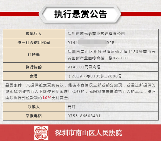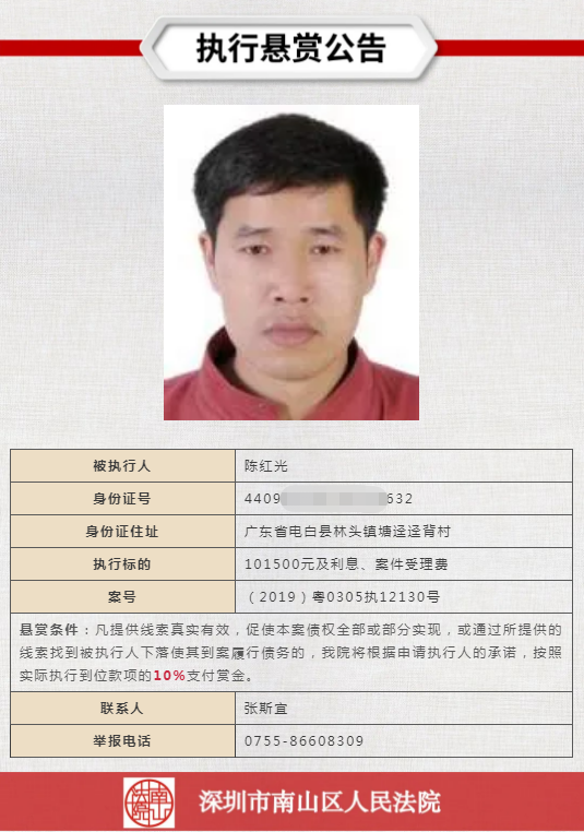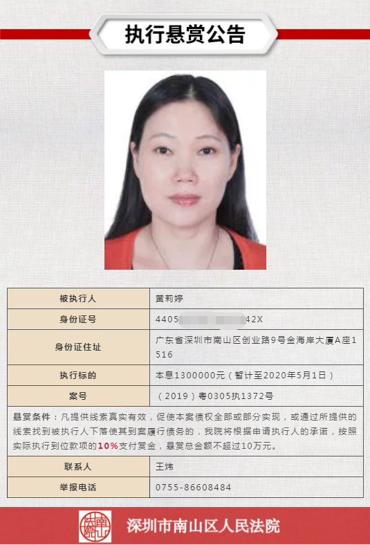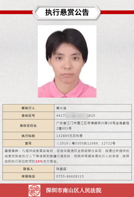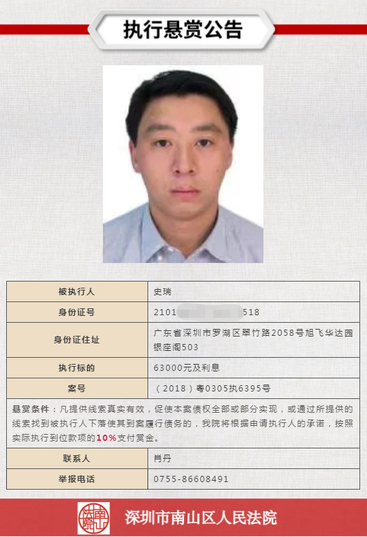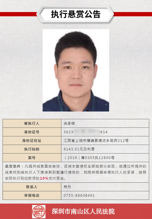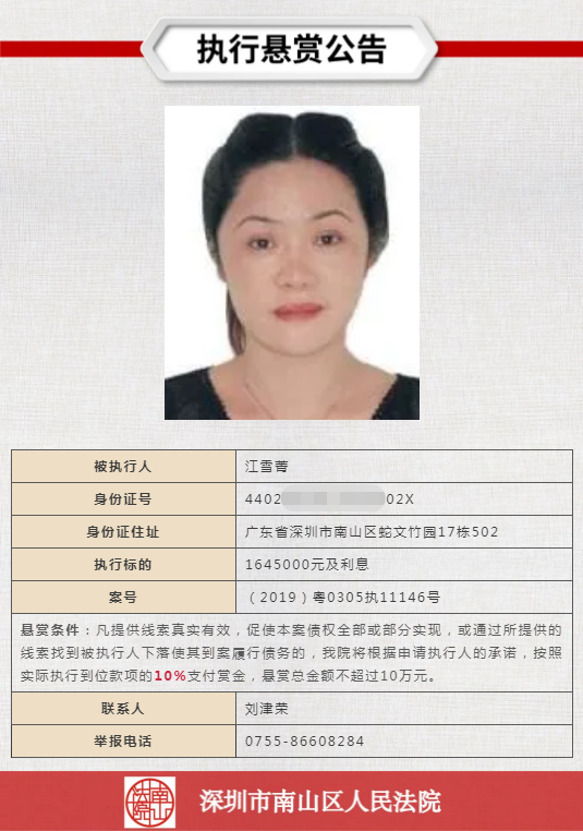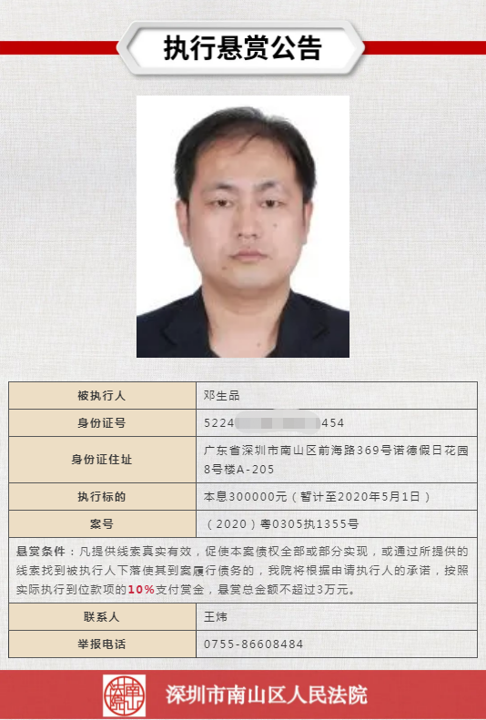 經(jīng)申請(qǐng)執(zhí)行人申請(qǐng),深圳市南山區(qū)人民法院向社會(huì)發(fā)布懸賞舉報(bào)公告,凡提供線(xiàn)索真實(shí)有效,促使本案?jìng)鶛?quán)全部或部分實(shí)現(xiàn),或通過(guò)所提供的線(xiàn)索找到被執(zhí)行人下落使其到案履行債務(wù)的,深圳市南山區(qū)人民法院將根據(jù)申請(qǐng)執(zhí)行人的承諾,按照實(shí)際執(zhí)行到位款項(xiàng)給予一定金額的賞金。