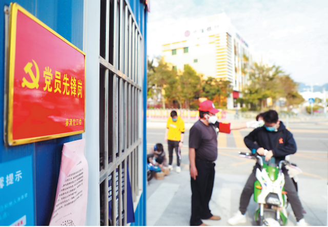 深圳市大鵬新區(qū)葵涌街道三溪社區(qū)防控檢疫點(diǎn)上的黨員先鋒崗。南方日?qǐng)?bào)記者朱洪波攝