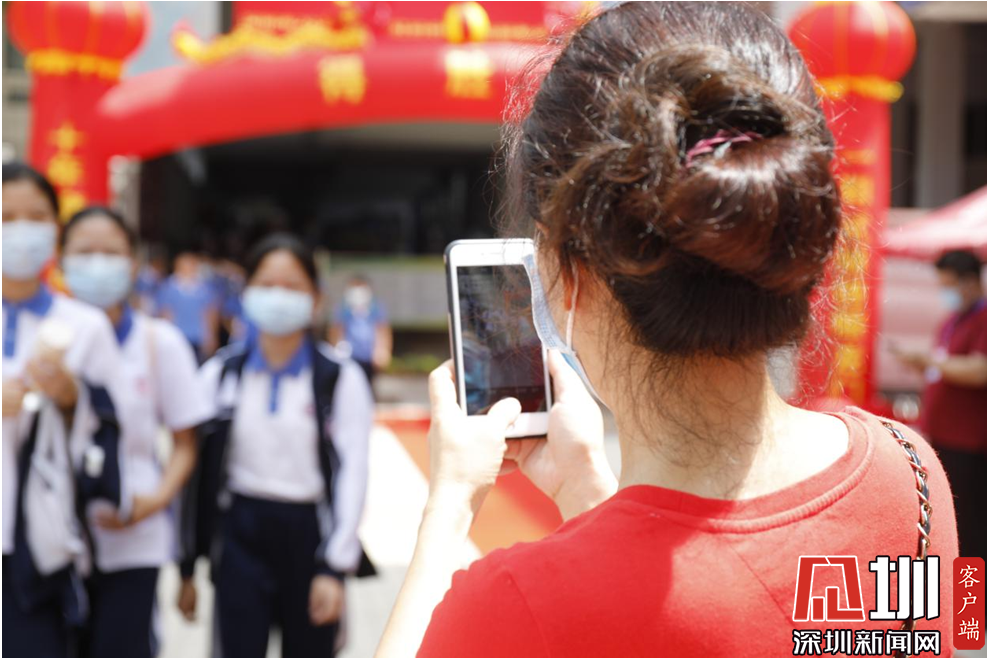 一位家長(zhǎng)正在給走出考點(diǎn)的女兒拍照留念。
