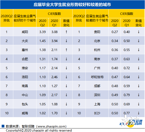 《報(bào)告》顯示,二季度應(yīng)屆生CIER指數(shù)較高的城市為二、三線城市,例如,咸陽、大慶、惠州、合肥和淮安等,這些城市的CIER指數(shù)均要高于1。而在應(yīng)屆生就業(yè)景氣較差的城市中,北上廣深等一線城市,以及杭州、南京、成都等新一線城市的應(yīng)屆生CIER指數(shù)相對(duì)較低,就業(yè)競(jìng)爭(zhēng)相對(duì)激烈。