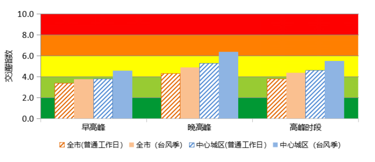 根據往年數據分析,臺風季期間受降雨影響,工作日深圳全市早、晚高峰時段道路交通運行指數將有所上升,預計工作日高峰時段全市交通運行水平處于“緩行”等級,通勤時長將比普通工作日多花費30%左右。其中,中心城區(qū)受降雨影響較大,早、晚高峰運行速度下降將較明顯。