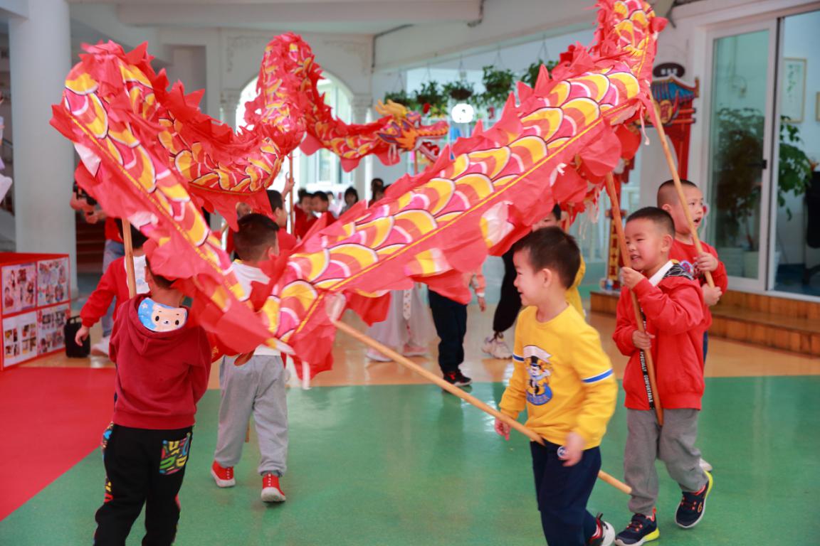 小朋友們?cè)阼尮穆曋邪菏讛[尾,蜿蜒游走,舞得像模像樣。