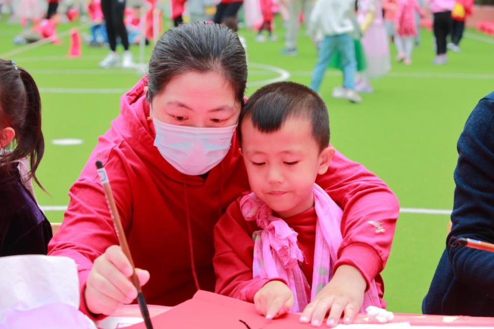 大手握小手,一起寫“福”字。