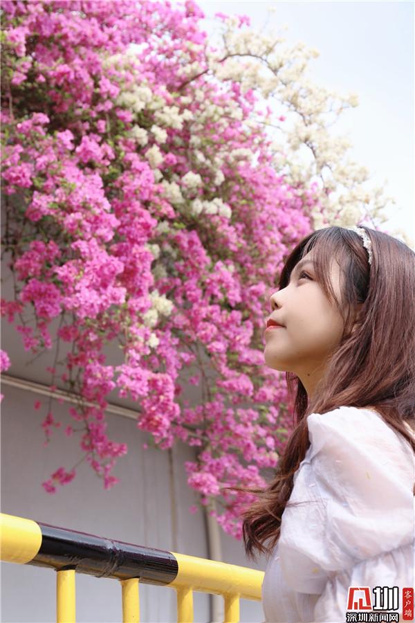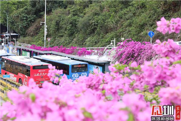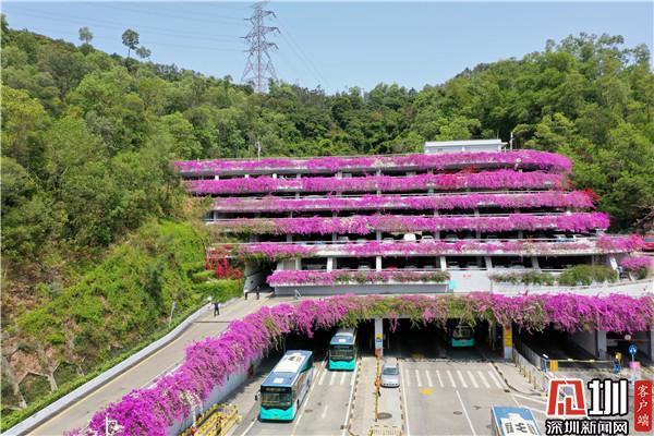 三月末,春深處,粉紫色的花朵環(huán)繞著停車場肆意綻放,與深圳藍相映成趣。