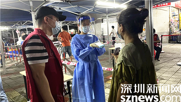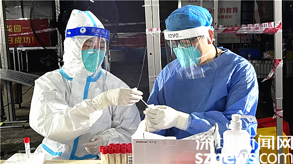 連日來,在羅湖區(qū)各大核酸檢測點,醫(yī)護(hù)人員頂著烈日驕陽,身著密閉防護(hù)服,戴著隔離面罩,全副武裝奮戰(zhàn)在一線為市民進(jìn)行核酸檢測。