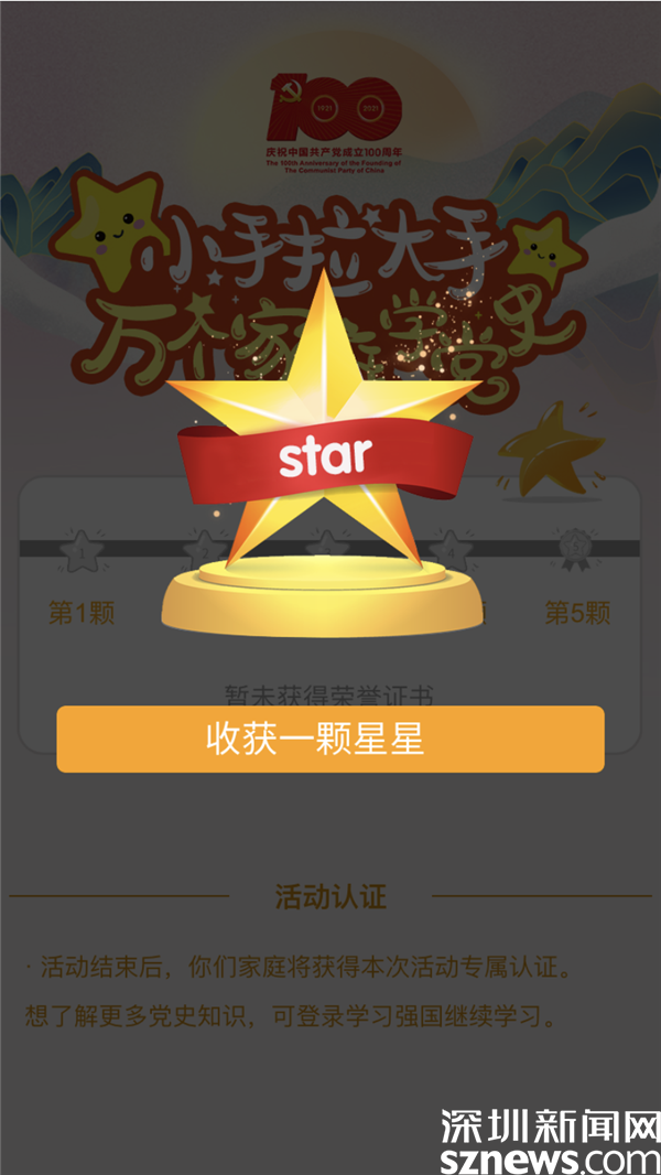 本次活動面向羅湖轄區(qū)中小學(xué)學(xué)生及家庭。6月28日至7月8日,學(xué)生及家長可以下載“羅湖Plus”APP,點(diǎn)擊首頁“服務(wù)”進(jìn)入“小手拉大手黨史學(xué)習(xí)”活動專欄并完成注冊。活動期間,每完成1次打卡即答對全部題目,可獲得1次親子“點(diǎn)亮星星”的機(jī)會。每輪答題如有1道答錯即為“闖關(guān)失敗”,可以點(diǎn)擊“再來一次”繼續(xù)答題,直到全部答對為止。10天內(nèi)完成5次打卡任務(wù),即可點(diǎn)亮5顆小星星獲得“升旗手”個(gè)人榮譽(yù)證書。