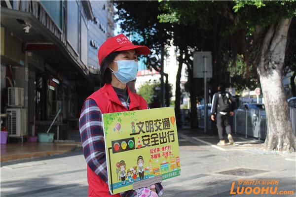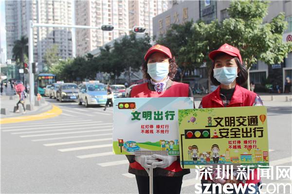 據(jù)了解,老圍社區(qū)黨委將創(chuàng)建文明城市納入常態(tài)化工作之中,黨群服務(wù)中心的社工迅速組建了創(chuàng)文小分隊,長期堅守在紅寶路和寶安南路的十字路口勸導(dǎo)交通。這是一條繁忙的十字路口,前有桂園小學(xué),后有盒馬超市,左邊是京基100寫字樓,右邊是地王大廈,周圍都是居民住宅小區(qū),每天車水馬龍,行人如織。尤其上班早高峰,路口更是熙來攘往川流不息。志愿者們守在路口,全神貫注,時刻留意那些準(zhǔn)備闖紅燈的騎行者,不走斑馬線的行人,勸導(dǎo)他們遵守交通規(guī)則,保障正常的交通秩序。