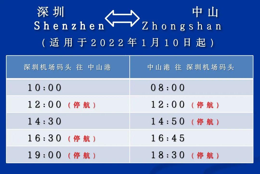 同時(shí),1月10日起,深圳機(jī)場(chǎng)碼頭至中山港航線船班保留每日2進(jìn)2出:10:00、14:30 深圳機(jī)場(chǎng)碼頭出發(fā)前往中山港;08:00、16:45 中山港出發(fā)前往深圳機(jī)場(chǎng)碼頭。