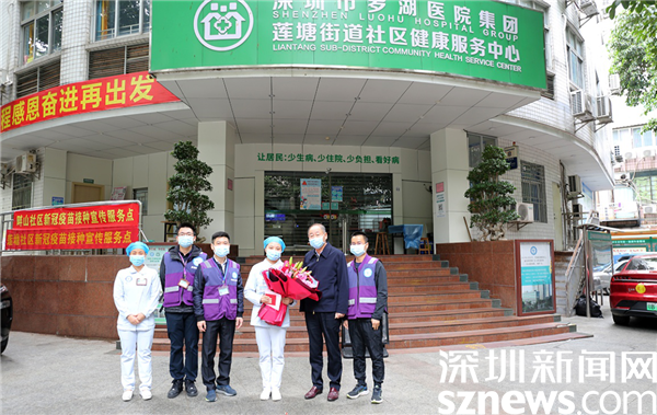 1月13日是王津原定舉行婚禮的日期,她仍然沒有例外地出現(xiàn)在蓮塘社康的采樣隊(duì)伍中。盡管不能出現(xiàn)在婚宴現(xiàn)場(chǎng),但是并肩作戰(zhàn)的社康同事給王津錄了一個(gè)祝福視頻給她祝賀,羅湖醫(yī)院集團(tuán)黨委書記、院長(zhǎng)孫喜琢也來(lái)到蓮塘社康,向依然堅(jiān)守崗位的新娘王津送上了鮮花和新婚祝福,感謝她的辛勤付出,并對(duì)所有在抗疫一線的醫(yī)務(wù)工作者表示感謝,“是你們?cè)谑刈o(hù)羅湖、守護(hù)深圳的安全,你們辛苦了!”
