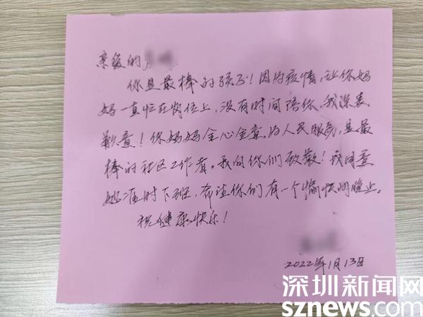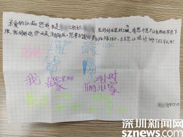讀特客戶端·深圳新聞網(wǎng)1月13日訊(見習(xí)記者 覃鈺清 通訊員 張晴晴)“親愛的lín dǎo您好……我媽媽在您那工作,這些天都沒能陪我,請你讓她6點(diǎn)30分下班可以嗎?”,1月13日,羅湖區(qū)南湖街道羅湖社區(qū)黨委書記姜德榮收到了一封特別的來信。這封信來自社區(qū)工作人員彭女士可愛的女兒,信上的內(nèi)容圖文并茂,表達(dá)了一個10歲小女孩的小心愿,希望媽媽可以早點(diǎn)下班,回家陪她。