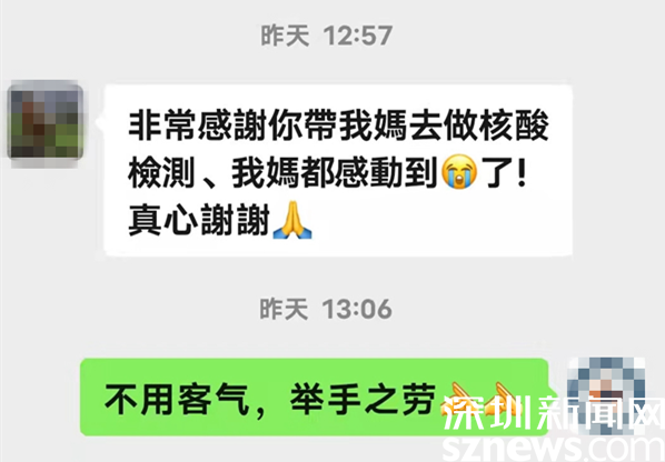 原來,“紅馬甲”是老圍社區(qū)網(wǎng)格員劉珍蓮,她陪老人李曉萍來做核酸檢測。檢測順利結(jié)束,老人一激動,就抱著劉珍蓮哭了起來。事后,老人的兒子,身在香港的溫先生給劉珍蓮發(fā)來微信,說:“非常感謝你帶我媽去做核酸檢測,我媽都感動到哭了?!?/p>