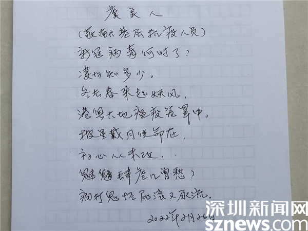 他在《虞美人》寫道:新冠病毒何時了?凄切知多少,冬去春來起妖風,港粵大地瘟疫籠罩中。披星戴月使命在,初心從未改,魅魑肆虐幾曾愁?痛打鬼怪屁滾又尿流。