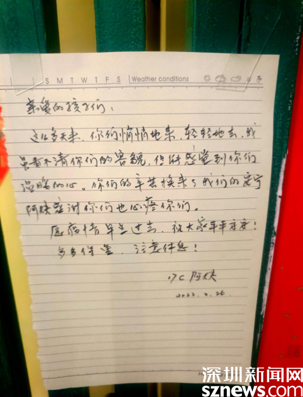“親愛的孩子們,這么多天來(lái),你們悄悄地來(lái),輕輕地去,我雖看不清你們的容顏,但能感受到你們溫暖的心。你們的辛苦換來(lái)了我們的安寧,阿姨感謝你們也心疼你們?!边@是來(lái)自桂園街道華瑞大廈B座居民的手寫感謝信,一句“親愛的孩子們”戳中了現(xiàn)場(chǎng)工作人員的心,讓人忍不住淚目。