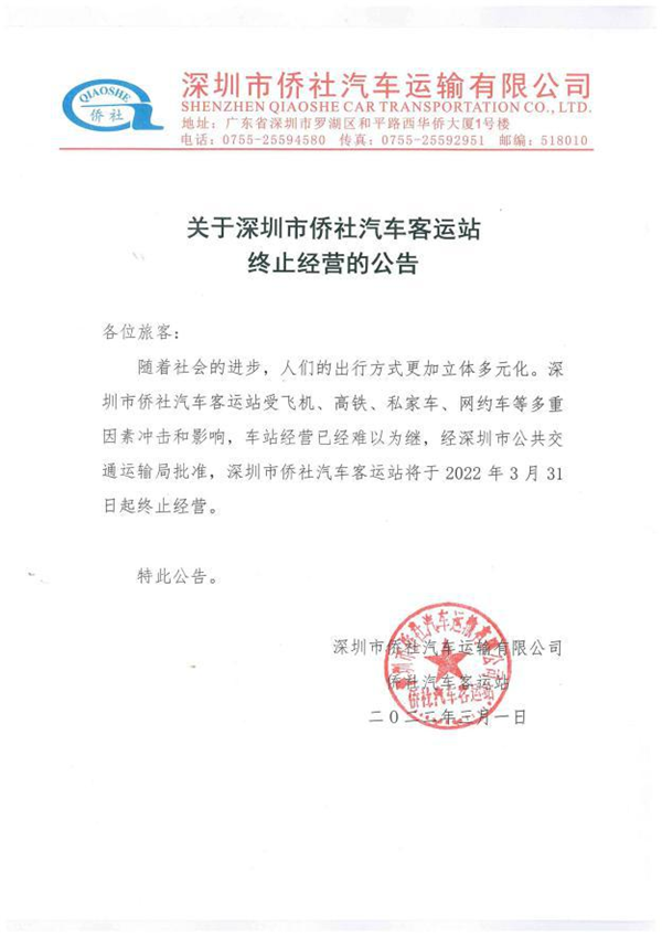 近日,記者從深圳市交通運(yùn)輸局羅湖管理局獲悉,自2022年3月31日起,深圳市僑社汽車客運(yùn)站終止經(jīng)營,這個營業(yè)了31年的“老牌”汽車客運(yùn)站,正式宣布退休。