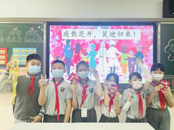502班的返校儀式“愛意濃濃”。紅色拉花讓每個孩子都喜氣洋洋;桌上班主任老師親手折的小禮盒和各式各樣的糖果讓孩子們甜蜜加倍;還有暖心“紅包”,里面有老師們一筆一畫書寫給孩子們的驚喜,更是寄托了無限的關心與激勵。