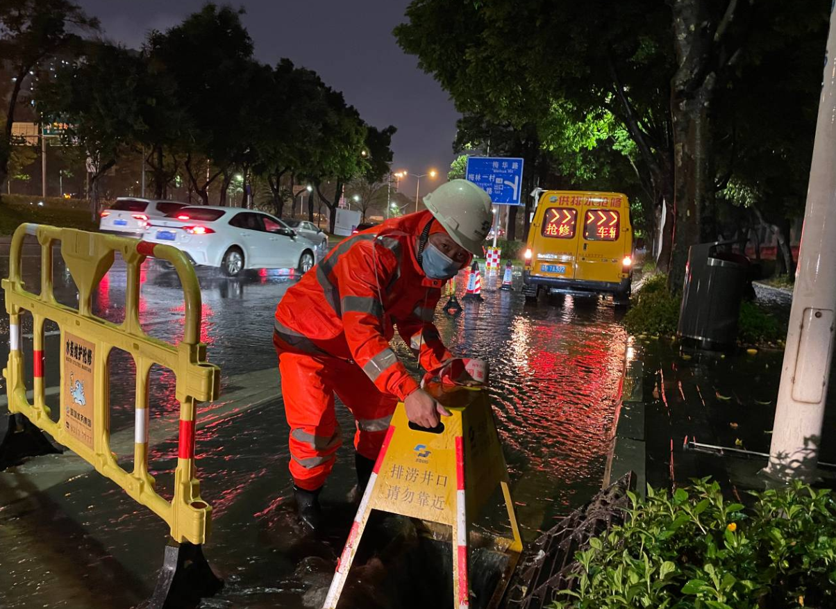 深圳環(huán)水集團(tuán)福田分公司員工堅(jiān)守在北環(huán)立交梅秀路口易淹點(diǎn),打開(kāi)雨水篦子加速排水。(深圳新聞網(wǎng)記者 潘潤(rùn)華 通訊員 陶柳)