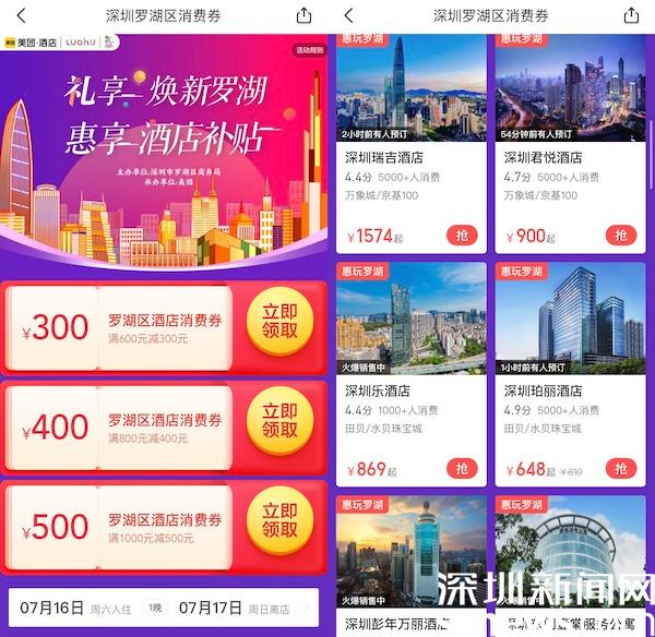 讀特客戶(hù)端·深圳新聞網(wǎng)2022年7月16日訊(記者 覃鈺清)7月16日,羅湖區(qū)會(huì)同羅湖區(qū)酒店行業(yè)協(xié)會(huì)、美團(tuán)推出“禮享煥新羅湖,惠享酒店補(bǔ)貼”活動(dòng),投入33萬(wàn)扶持資金,用于支持酒店、住宿消費(fèi)。消費(fèi)者可在美團(tuán)APP搜索“羅湖消費(fèi)券”、“羅湖酒店消費(fèi)券”等關(guān)鍵詞進(jìn)入活動(dòng)頁(yè)面,點(diǎn)擊“領(lǐng)取”按鈕即可獲得。本次優(yōu)惠額度包括:滿(mǎn)1000元減500元、滿(mǎn)800元減400元、滿(mǎn)600元減300元,最高五折優(yōu)惠,可在羅湖轄區(qū)內(nèi)40余家酒店使用。