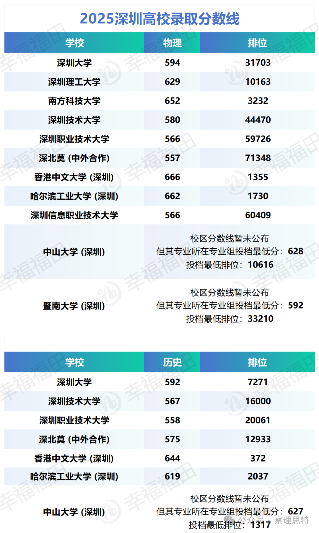 從整體數(shù)據(jù)來看,深圳高校在物理類投檔中表現(xiàn)尤為突出,哈爾濱工業(yè)大學(xué)(深圳)、南方科技大學(xué)、深圳理工大學(xué)在省內(nèi)高校中位居前3。歷史類投檔中,深圳高校同樣表現(xiàn)不俗,哈爾濱工業(yè)大學(xué)(深圳)、深圳大學(xué)在全省所有高校中排名前10,反映出深圳高校文理均衡發(fā)展的良好態(tài)勢(shì)。