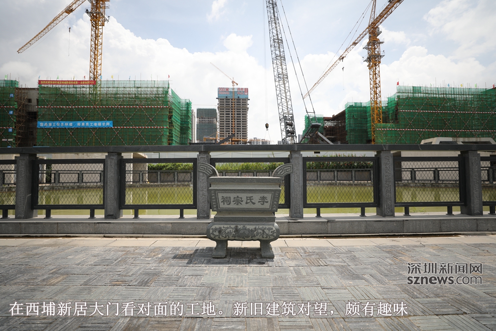 我們到訪西埔新居的時候,周邊的工地正如火如荼開工,運送建筑材料的貨車從西埔新居一側的通道進進出出,站在圍屋前的半月形池塘,就可看到高大的吊車和迅速長高的現(xiàn)代樓宇,村里安靜,村外喧囂,兩個世界。
