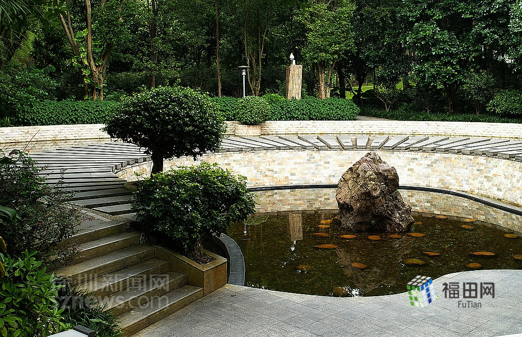 四季廣場(chǎng)旁的人工水池,池水都是從山水引下來的。