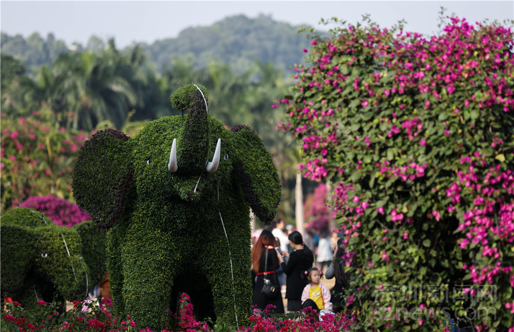 蝴蝶在簕杜鵑花上飛舞、逗留,孩子跟媽媽在簕杜鵑花壇旁玩耍,游客駐足于簕杜鵑花旁賞花拍照,構(gòu)成了一幅蓮花山公園的動人畫卷。另外,風(fēng)箏廣場草坪上制作了高達(dá)6米, 占地300多平方米的大型立體花壇,以“復(fù)興號”高鐵、大雁塔、凱旋門等 “一帶一路”元素,以艷麗的簕杜鵑做點(diǎn)綴,美麗的花海景觀。