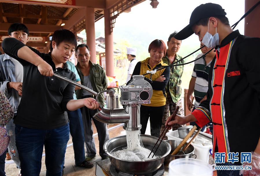 4月19日,在廣西南寧市青秀區(qū)南陽鎮(zhèn)施厚村古岳坡,游客在觀看米粉制作。今年“壯族三月三”假期期間,不少市民游客前往鄉(xiāng)村旅游觀光,激發(fā)了一股鄉(xiāng)村旅游小熱潮?!皦炎迦氯笔菑V西壯族自治區(qū)確定的法定假期。新華社記者陸波岸 攝