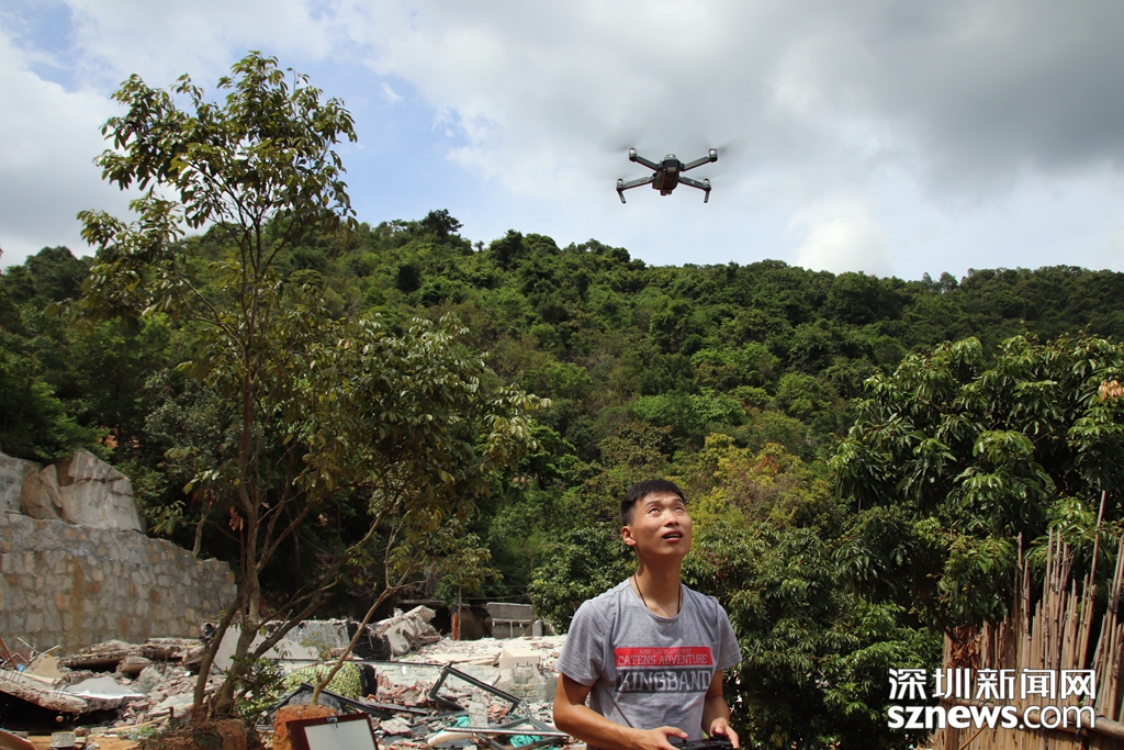 深圳新聞網(wǎng)記者正在操作無(wú)人機(jī)對(duì)羊臺(tái)山兩棟拆除后的違法建筑廢墟進(jìn)行拍攝