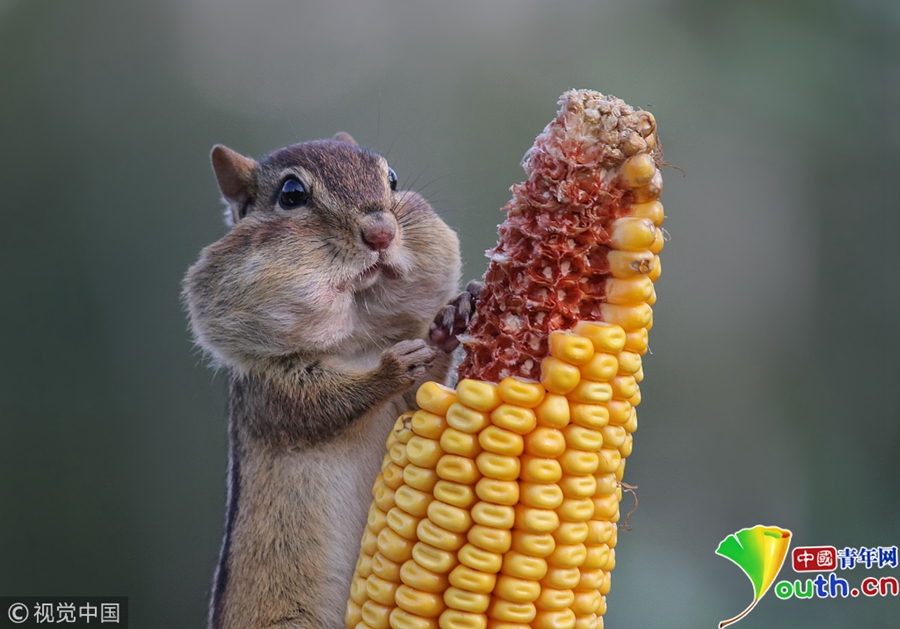 2010年9月,加拿大安大略湖,一只花栗鼠在啃食玉米,腮幫子鼓鼓的。