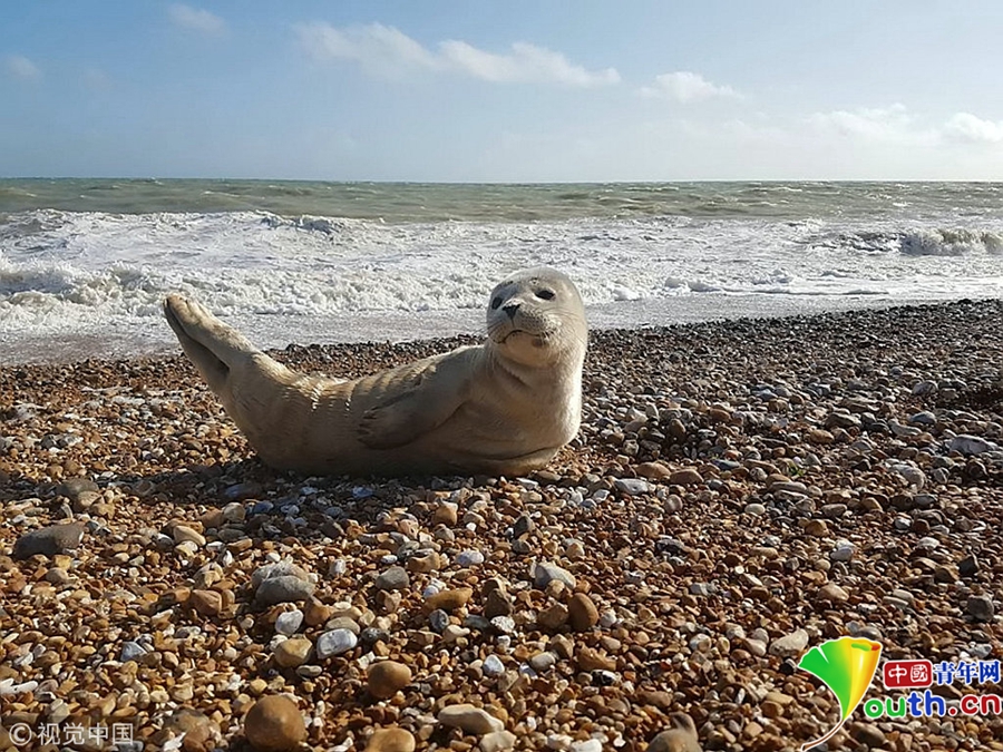 英國肯特郡鄧杰內(nèi)斯,46歲的達(dá)倫·伍德帶著鄰居家的孩子們釣魚,這只可愛的海豹爬出海面跟他們“打招呼”。