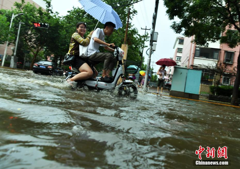河北石家莊遭遇暴雨 道路積水民眾涉水出行