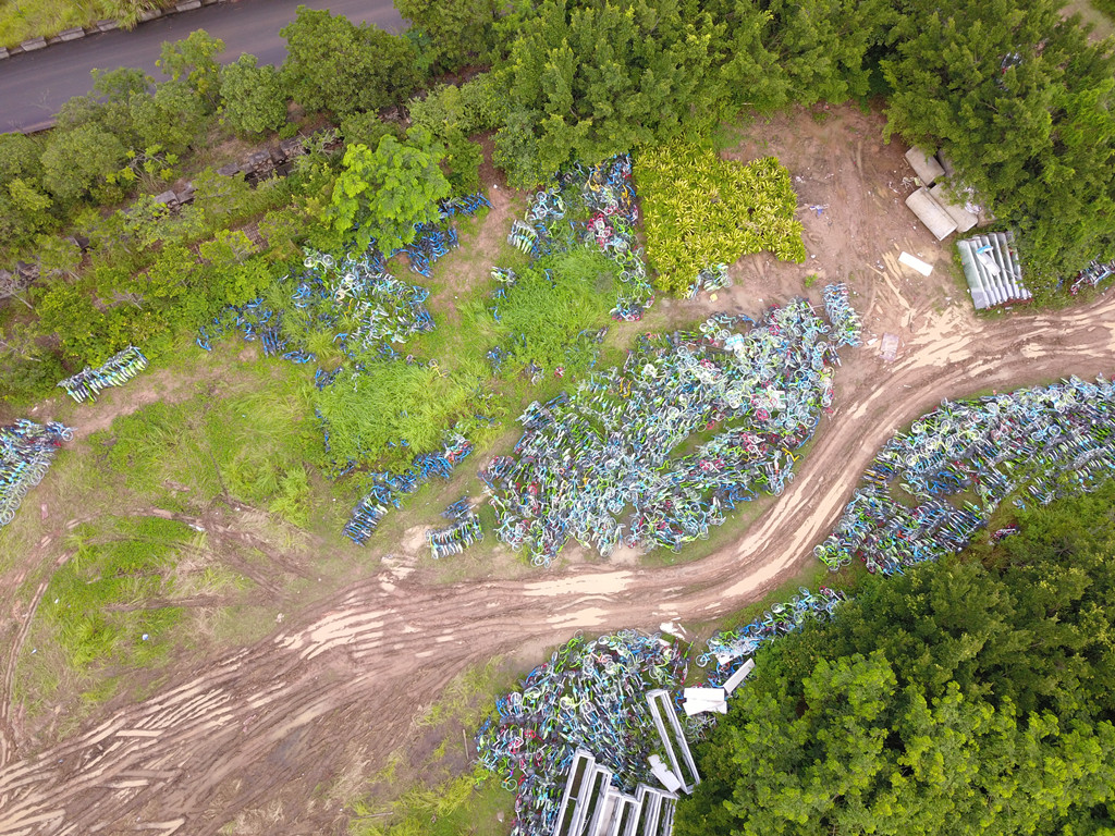 從高空俯瞰,安托山山頂?shù)墓蚕韱诬嚩逊e無序、且周圍雜草叢生,猶如一片共享單車“墳場”