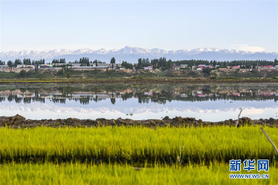 在新疆察布查爾錫伯自治縣種羊場托海依村拍攝的一處農(nóng)田,秧苗與遠(yuǎn)處的雪山相映成趣(5月21日攝)。近日,隨著氣溫漸高,地處新疆伊犁河谷的察布查爾錫伯自治縣迎來插秧高峰期,田間地頭一派繁忙景象。塊塊稻田水滿如鏡,田間防護(hù)林枝繁葉茂,遠(yuǎn)處雪山依稀可見,如一幅在大地上鋪展開的生態(tài)畫卷。新華社記者胡虎虎 攝