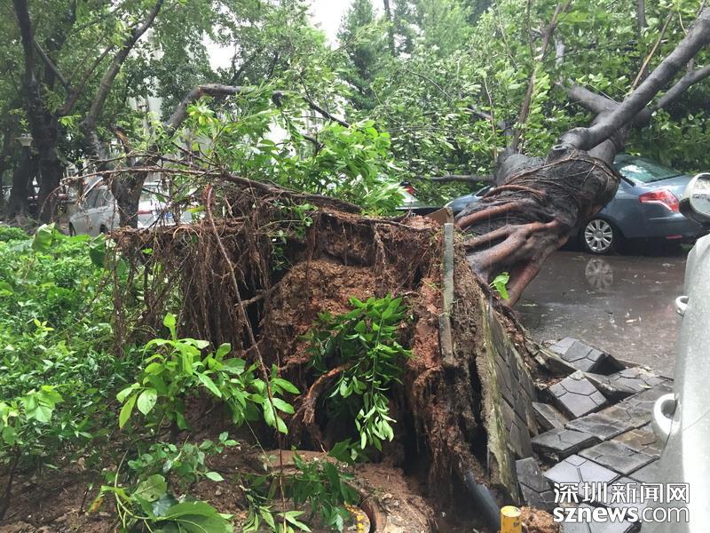 在蓮花北村靠近北環(huán)中學的小路,記者注意到拉起警戒線,有多株樹木經(jīng)不住大風考驗,已投降就地倒下。