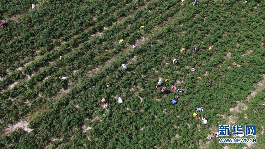 9月16日,阜城縣王集鄉(xiāng)南張莊村農(nóng)民在采摘辣椒(無人機(jī)拍攝)。近年來,河北省阜城縣王集鄉(xiāng)在推進(jìn)產(chǎn)業(yè)富民過程中,積極引導(dǎo)農(nóng)民調(diào)整農(nóng)業(yè)產(chǎn)業(yè)結(jié)構(gòu),按照品種特色化、種植規(guī)?;?、產(chǎn)銷一體化的“公司+基地+農(nóng)戶”的經(jīng)營(yíng)模式,鼓勵(lì)農(nóng)民發(fā)展特色辣椒種植,推行“訂單種植”模式,開辟出了一條農(nóng)民創(chuàng)收新路徑。目前,阜城縣王集鄉(xiāng)辣椒種植面積3100余畝,每畝年收益2500元以上,帶動(dòng)當(dāng)?shù)剞r(nóng)民實(shí)現(xiàn)增收。新華社記者朱旭東攝