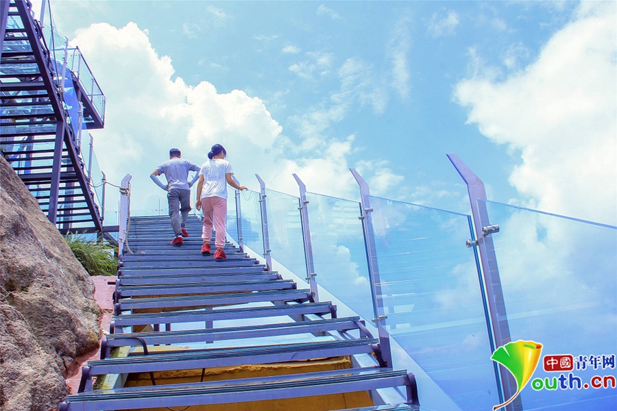 2018年8月,廣東清遠(yuǎn)。如今,玻璃橋、玻璃觀景臺、玻璃漂流道、玻璃滑道等玻璃產(chǎn)品可以說多如牛毛,琳瑯滿目。這些玻璃產(chǎn)品都是水平的,即使有坡度,也是借助工具滑下去的。小伙伴們是否挑戰(zhàn)體驗(yàn)過像樓梯一樣的玻璃天梯,階梯式攀向高處,直聳云宵,云霧飄渺。
