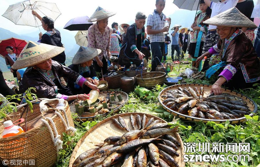 2016年9月17日,貴州省榕江縣平陽鄉(xiāng)硐里村七位侗家婦女們正燒魚。每年中秋時(shí)節(jié),當(dāng)?shù)囟弊逋_田放水,捉魚,全寨男女老少,野外生起篝火烤魚,用烤魚、米酒等,祭祀魚神,祈禱魚糧豐收的傳統(tǒng)民俗活動(dòng)。