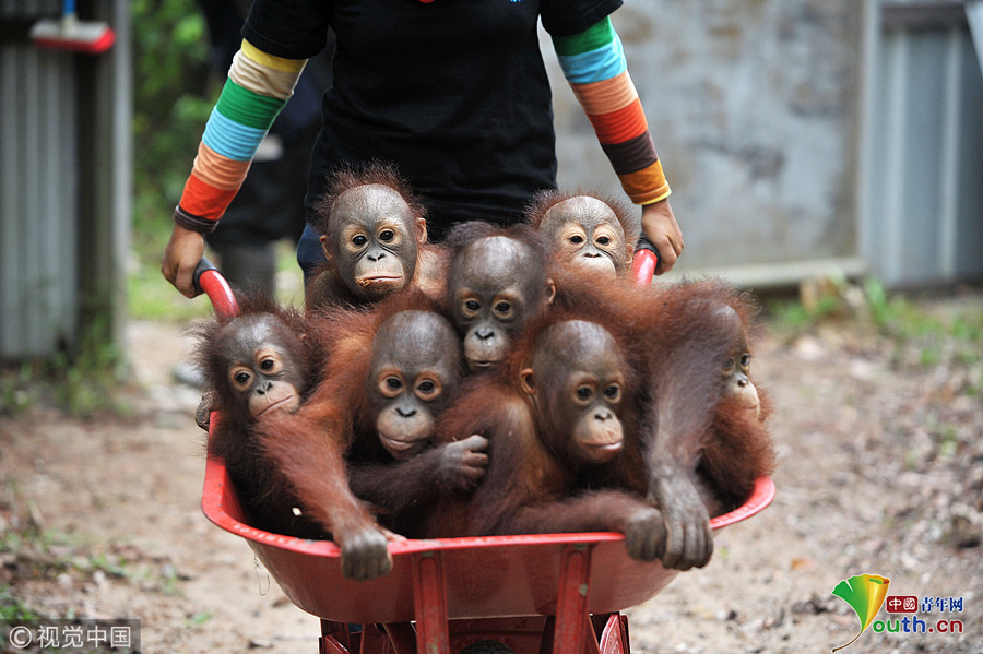 印尼加里曼丹克塔邦,國(guó)際動(dòng)物救援(IAR)猩猩安全與保護(hù)中心里,飼養(yǎng)員用獨(dú)輪車(chē)把猩猩寶寶送到森林學(xué)校。圖片作者:Newscom