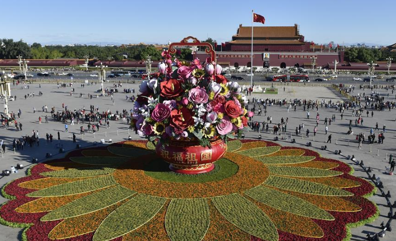 “祝福祖國(guó)”巨型花籃全面亮相