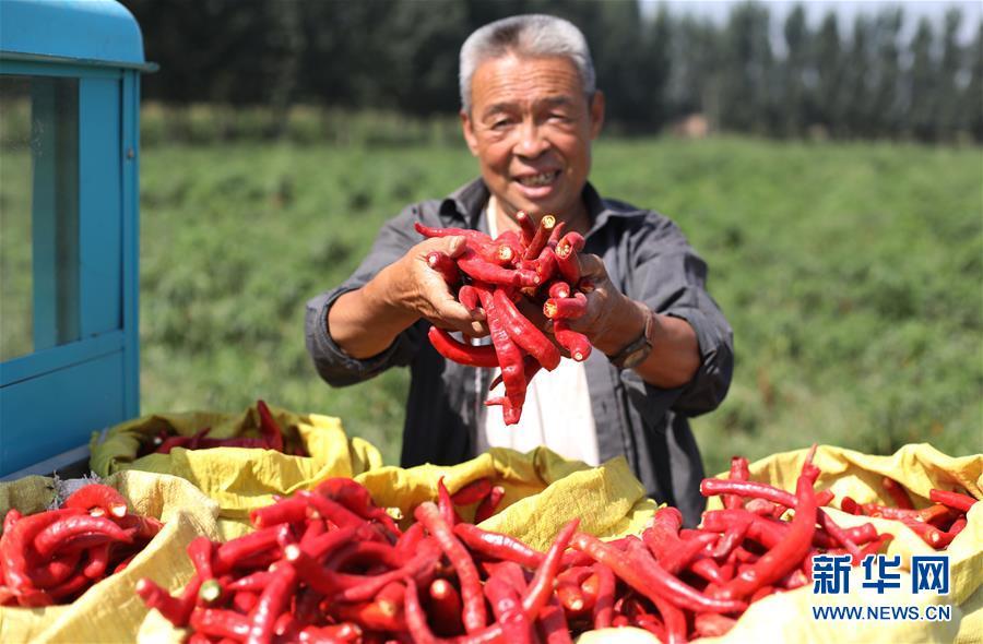 9月16日,阜城縣王集鄉(xiāng)南張莊村農(nóng)民在展示采摘的辣椒。近年來,河北省阜城縣王集鄉(xiāng)在推進產(chǎn)業(yè)富民過程中,積極引導農(nóng)民調(diào)整農(nóng)業(yè)產(chǎn)業(yè)結構,按照品種特色化、種植規(guī)?;?、產(chǎn)銷一體化的“公司+基地+農(nóng)戶”的經(jīng)營模式,鼓勵農(nóng)民發(fā)展特色辣椒種植,推行“訂單種植”模式,開辟出了一條農(nóng)民創(chuàng)收新路徑。目前,阜城縣王集鄉(xiāng)辣椒種植面積3100余畝,每畝年收益2500元以上,帶動當?shù)剞r(nóng)民實現(xiàn)增收。新華社記者朱旭東攝