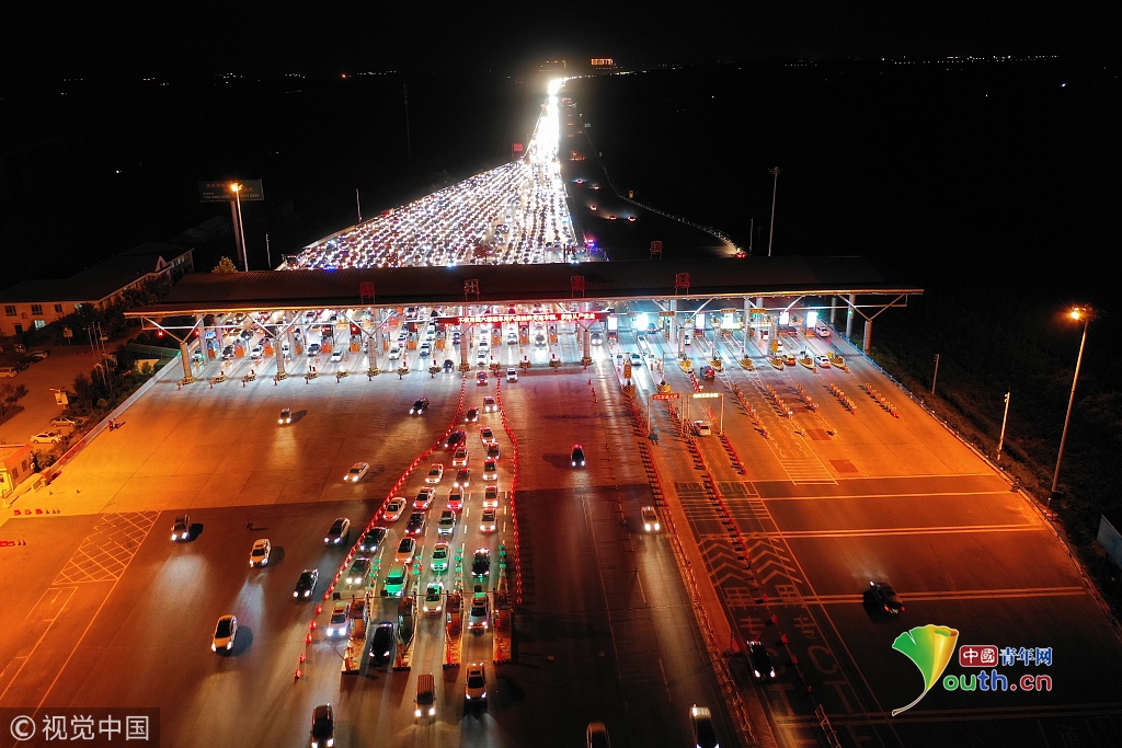 2018年9月24日,鄭州,在河南鄭州南收費站,排隊出高速的汽車仍然排著長長的隊伍。當天是中秋節(jié)小長假的最后一天,全國各地迎來返程客流高峰。