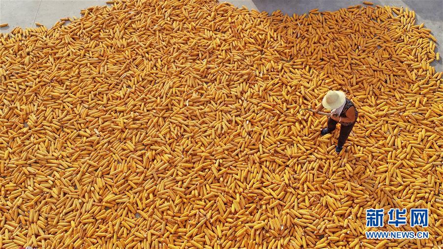 9月23日,河北省灤縣茨榆坨鎮(zhèn)西長(zhǎng)坨村農(nóng)民在晾曬玉米(無(wú)人機(jī)拍攝)。