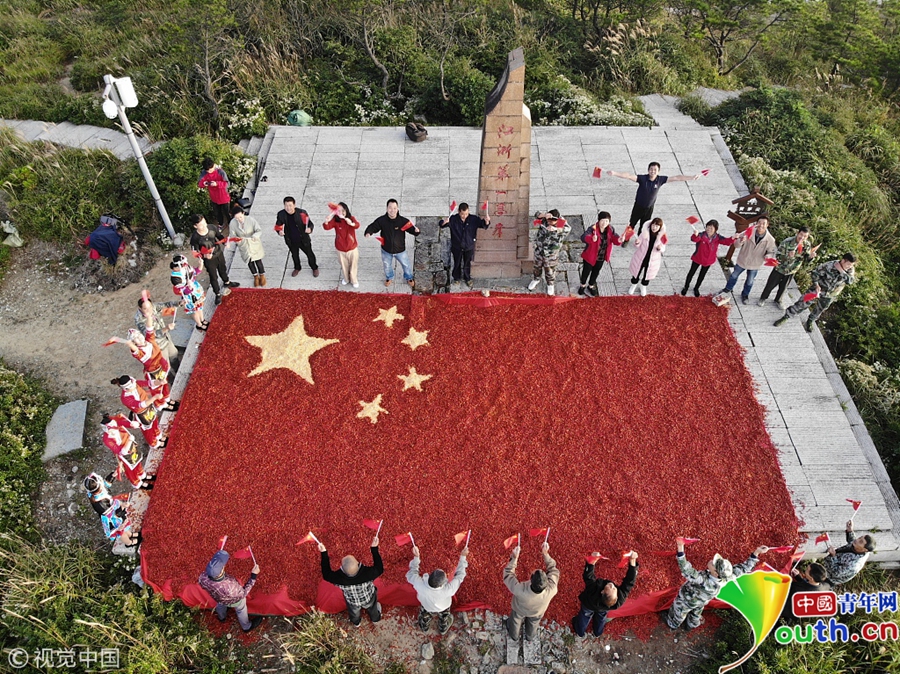 中國青年網(wǎng)北京9月26日電 9月26日,長三角第一高峰浙江龍泉山農(nóng)作物喜獲豐收,當?shù)剞r(nóng)民與游客用8噸剛收獲的辣椒以及玉米,在山頂?shù)脑坪V衅闯隽艘幻骈L10米、寬6.6米的巨型國旗慶祝豐收。圖片來源:視覺中國