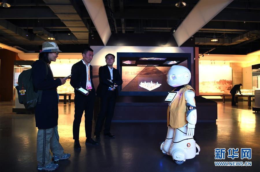 9月27日,在敦煌國(guó)際會(huì)展中心,機(jī)器人為參觀者講解“古道天馬——絲綢之路上的交通”展覽。 新華社記者范培珅攝