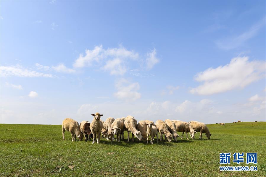 羊群在錫林郭勒盟正藍旗的草原上覓食(7月16日攝)。盛夏時節(jié),內(nèi)蒙古錫林郭勒草原一碧千里,遙接天際。藍天白云之下,牛羊悠閑自在,馬群奔馳其中,風光旖旎。 新華社記者 劉磊 攝
