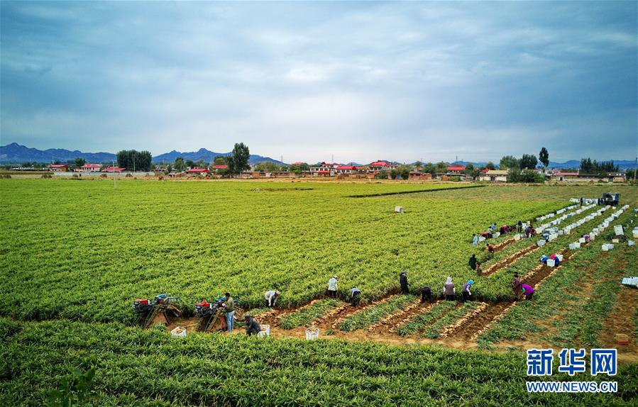 10月9日,秦皇島市撫寧區(qū)留守營鎮(zhèn)桑園村農(nóng)民在收獲生姜(無人機拍攝)。 近年來,河北省秦皇島市撫寧區(qū)在農(nóng)業(yè)結(jié)構(gòu)調(diào)整過程中,引導當?shù)剞r(nóng)民種植優(yōu)質(zhì)無公害生姜,并安排農(nóng)業(yè)技術(shù)員定期到田間指導農(nóng)民對生姜進行標準化管理。據(jù)介紹,今年該縣生姜種植面積1萬多畝,預(yù)計產(chǎn)生姜5萬噸,種植戶每畝純收入達1萬多元。 新華社記者 楊世堯 攝