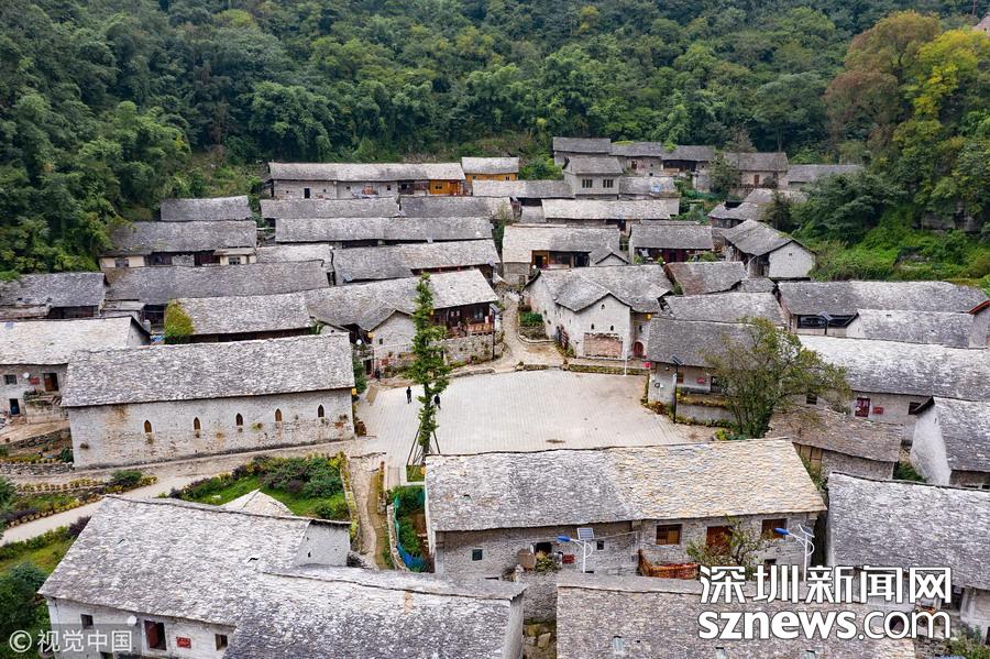 深圳新聞網(wǎng)訊 2018年9月27日,貴州安順,航拍坐落在群山中的鎮(zhèn)寧布依族苗族自治縣高蕩村。鎮(zhèn)寧高蕩村民居為石木結(jié)構(gòu)干欄式石板房,建造時(shí)間五、六十年至數(shù)百年不等,建筑保存基本完好。