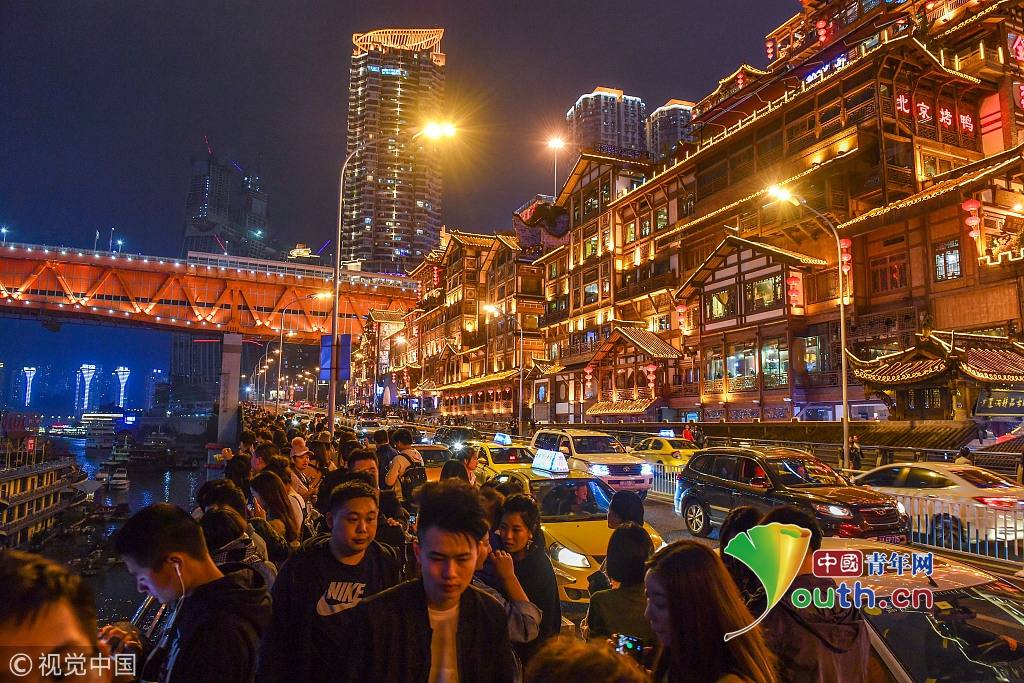 2018年10月8日,重慶,國慶長假結(jié)束后,山城網(wǎng)紅景點(diǎn)洪崖洞依然處于暴擠狀態(tài),在抖音等短視頻平臺(tái)走紅以后,絢爛輝煌的洪崖洞夜景成為赴渝旅行第一打卡景點(diǎn)。